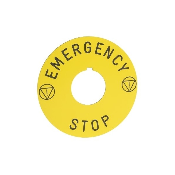 Legend Plate, Round, Legend Emergency Stop, For Use With 30mm Mushroom Heads, Legend/Background Color Yellow, Material Plastic, Width 1.9 in, Diameter 60 mm