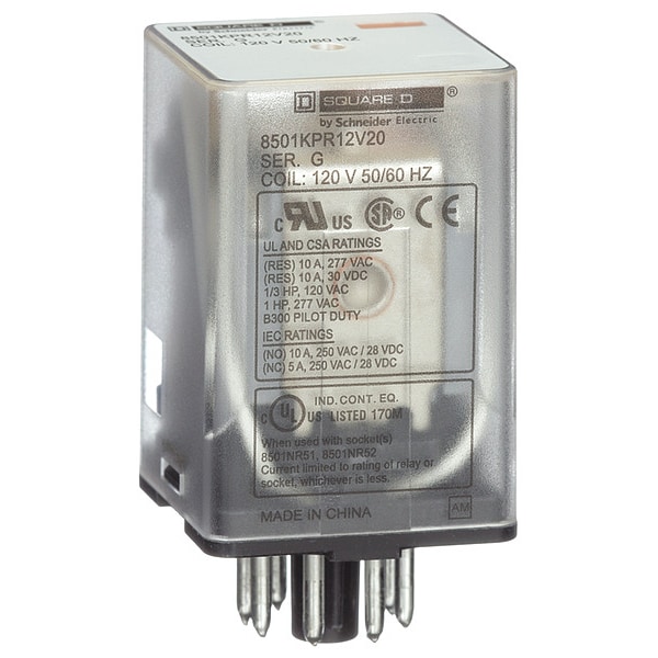 Relay, Base Shape Square, Coil Voltage 110V DC, Contact Form DPDT, Current Rating 10 A, Electrical Connection Quick-Connect, Flat Pin Width 0.189 in, Number of Pins 8, Pin Shape Flat, Sealing Enclosed, Status Indicator Mechanical Flag, Contact Rating (AC) 10 A @ 277V, Contact Rating (DC) 10 A @ 30V, Horsepower @ 120V AC 1/3 hp, Horsepower @ 240V AC 1 hp, Mounting Style Socket, Body Depth 1.4 in, Body Height 2.25 in, Body Width 1.37 in, Compatible with Manufacturer Model Number 8501NR82