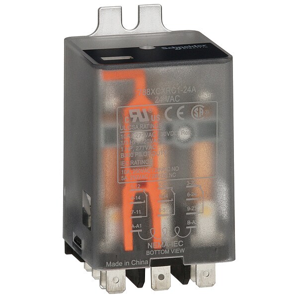 Flange Mount Relay, Base Shape Square, Coil Voltage 24V AC, Contact Form 3PDT, Current Rating 10 A, Electrical Connection Blade Terminal, Flat Pin Width 0.189 in, Number of Pins 11, Pin Shape Flat, Sealing Enclosed, Status Indicator Mechanical Flag, Contact Rating (AC) 10 A @ 277V, 5 A @ 250V-1 (NC), Contact Rating (DC) 10 A @ 28V, Horsepower @ 120V AC 1/3 hp, Mounting Style Side Flange, Body Depth 1.9 in, Body Height 1.4 in, Body Width 1.38 in, Coil Resistance 72 ohm