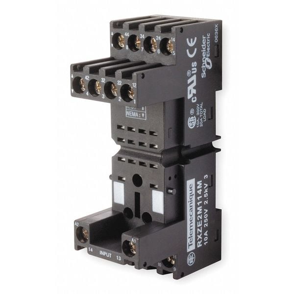 Relay Socket, Base Style Square, Contact Form 4PDT, DPDT, Current Rating 10 A, Electrical Connection Screw, Flat Pin Width 0.09 in, Number of Pins 14, Number of Terminals 14, Pin Shape Flat, Socket Type Elevator, Finger Safe, Contact Terminal Arrangement Mixed, Mounting Style DIN Rail & Surface, Color Black, Compatible Relays Harmony(TM) REXL Series, Harmony(TM) RXM Series, Contact Rating (AC) 10 A @ 250V, Depth 3.15 in, Height 1.69 in, IP Rating IP20, Maximum Operating Temperature 131 Degrees F