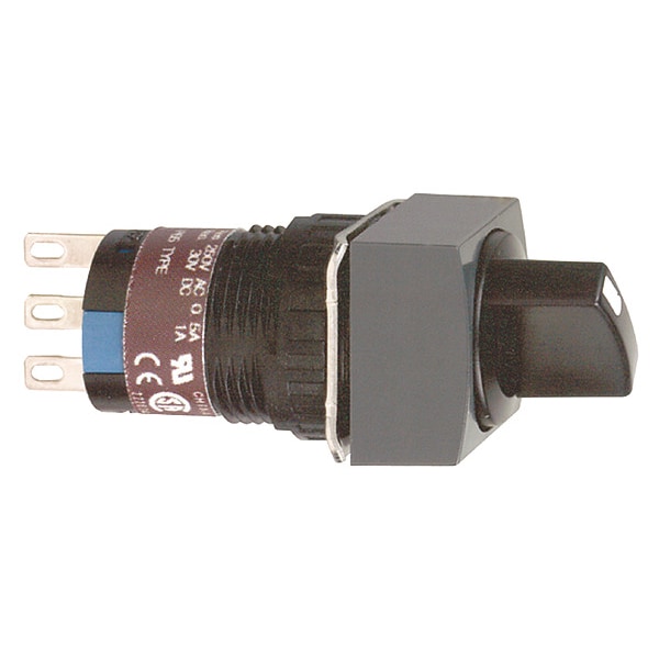 Selector Switch, 16 mm, 2 Position, Maintained/Maintained Action, DPDT Contact Form, Type of Operator Lever, Color Black, Operator Head Material Plastic, Basic Material Plastic, Bezel Material Plastic, Bezel Color Black, Contact Rating 0.15A @ 125V DC, 0.2A @ 125V DC, 0.7A @ 240V AC, 0.7A @ 24V DC, 1.5A @ 120V AC, 1A @ 120V AC, 1A @ 240V AC, 1A @ 24V DC, IP Rating IP65, Cam No Cam Included, Switch Operation @ Position C No Third Position, Standards CCC, cURus, Includes Standard Handle