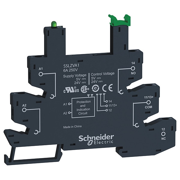 Slim Interface Relay Socket, Base Style Square, Compatible Relays SSL 24 V DC, SSL 5 V DC, Contact Form SPDT, Current Rating 6 A, Electrical Connection Spring Terminal, Number of Pins 5, Pin Shape Flat, Socket Type Standard, Contact Terminal Arrangement Separate, Mounting Style DIN Rail, Color Black, Compatible with Manufacturer Model Number SSLZVA1, Contact Rating (DC) 6 A @ 250V, Depth 3.09 in, Dielectric Strength 2,500V, Height 3.98 in, IP Rating IP20