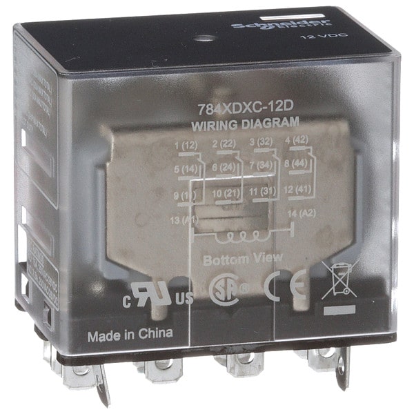 General Purpose Relay, Base Shape Square, Coil Voltage 12V DC, Contact Form 4PDT, Current Rating 15 A, Electrical Connection Faston Terminal, Flat Pin Width 0.187 in, Number of Pins 14, Status Indicator Mechanical Flag, Contact Rating (AC) 10 A @ 151/277V, 15 A @ 120 to 277/120/150/250V, 7.55 A @ 250V, Contact Rating (DC) 15 A @ 28V (NO), 7.55 A @ 28V (NC), Horsepower @ 120V AC 1/2 hp, Horsepower @ 240V AC 3/4 hp, Mounting Style Socket, Push-To-Test Method No Button, Body Depth 1.37 in