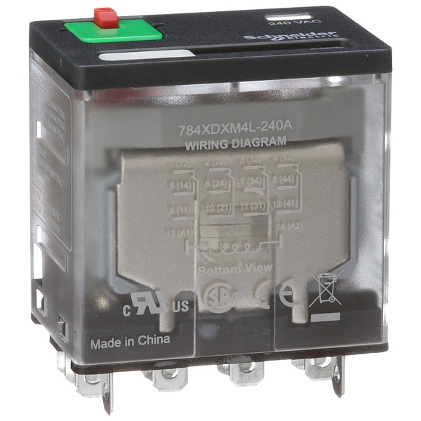 General Purpose Relay, Base Shape Square, Coil Voltage 240V AC, Contact Form 4PDT, Current Rating 15 A, Electrical Connection Faston Terminal, Flat Pin Width 0.187 in, Number of Pins 14, Status Indicator LED Indicator, Mechanical Flag, Contact Rating (AC) 10 A @ 151/277V, 15 A @ 120 to 277/120/150/250V, 7.55 A @ 250V, Contact Rating (DC) 15 A @ 28V (NO), 7.55 A @ 28V (NC), Horsepower @ 120V AC 1/2 hp, Horsepower @ 240V AC 3/4 hp, Mounting Style Socket, Push-To-Test Method Lockable