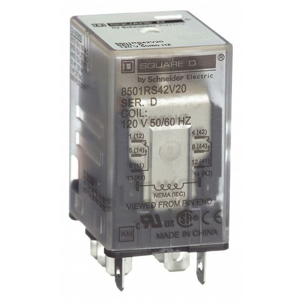 General Purpose Relay, Base Shape Square, Coil Voltage 120V AC, Contact Form DPDT, Current Rating 15 A, Electrical Connection Quick-Connect, Flat Pin Width 0.18 in, Number of Pins 8, Pin Shape Flat, Sealing Enclosed, Status Indicator Mechanical Flag, Contact Rating (AC) 15 A @ 120V, 15 A @ 277V, Contact Rating (DC) 10 A @ 28V, Horsepower @ 120V AC 1/2 hp, Horsepower @ 240V AC 1/10 hp, Mounting Style Socket, Push-To-Test Method No Button, Body Depth 1.65 in, Body Height 1.07 in