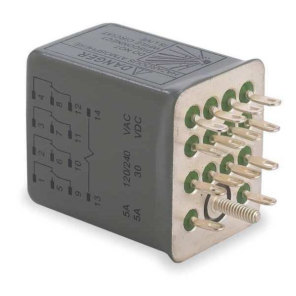 Hermetically Sealed Relay, Base Shape Square, Coil Voltage 120V AC, Contact Form 4PDT, Current Rating 5 A, Electrical Connection Quick-Connect, Flat Pin Width 0.09 in, Number of Pins 14, Pin Shape Flat, Sealing Hermetically Sealed, Status Indicator No Indicator, Contact Rating (AC) 5 A @ 120/240V, Contact Rating (DC) 5 A @ 28V, Horsepower @ 120V AC Not Rated, Horsepower @ 240V AC Not Rated, Mounting Style Socket, Push-To-Test Method No Button, Body Depth 1.4 in, Body Height 2.77 in