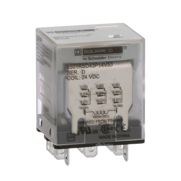 Relay, Base Shape Square, Coil Voltage 24V DC, Contact Form 3PDT, Current Rating 15 A, Electrical Connection Quick-Connect, Flat Pin Width 0.18 in, Number of Pins 11, Pin Shape Flat, Sealing Enclosed, Status Indicator LED Indicator, Mechanical Flag, Contact Rating (AC) 1.5 A @ 240V, 10 A @ 120V, 3 A @ 120V, 7 A @ 277V, Contact Rating (DC) 10 A @ 28V, Horsepower @ 120V AC 1/2 hp, Horsepower @ 240V AC 1 hp, Mounting Style Socket, Push-To-Test Method No Button, Body Depth 1.4 in