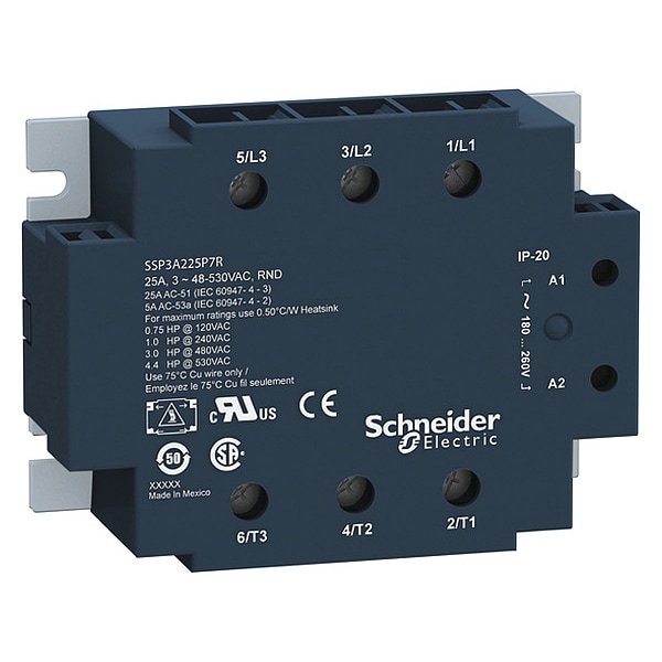 Solid State Relay, Electrical Connection Screw Clamp, Heat Sink Not Included, Input Current 24 to 35 mA, Input Voltage 4 to 32V DC, Maximum Output Current with Heat Sink 25 A, Maximum Output Current without Heat Sink Not Recommended, Output Switching Mode Random/Instantaneous, Output Voltage Range 48 to 530V AC, Standards CE Certified, CSA Certified, IEC 60950-1, IEC 61000, IEC 62314, UL Listed, Switch Component Type SCR, Current Type DC, Electrical Phase Three, Finger Safe Yes