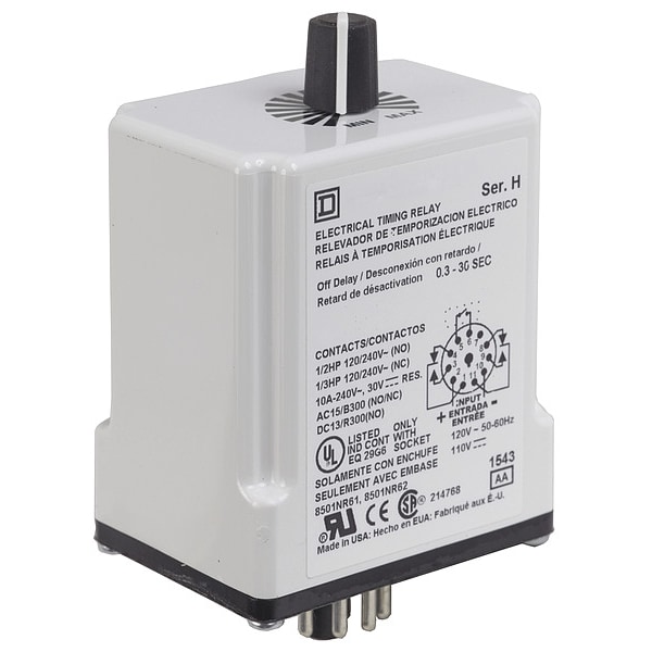 Time Delay Relay, Adjustment Method Rotary Knob, Base Shape Octal, Coil Voltage 24V AC/DC, Contact Form DPDT, Contact Rating (AC) 10A @ 24V, Contact Rating (DC) 10A @ 24V, Delay Function Off Delay, Electrical Connection Socket, Number of Pins 11, Mounting Style Plug-In, Body Depth 2.4 in, Body Height 4.09 in, Body Width 1.69 in, Compatible with Grainger Part Number 5B584, 5B585, Contact Material Silver Nickel, Frequency 50 Hz, 60 Hz