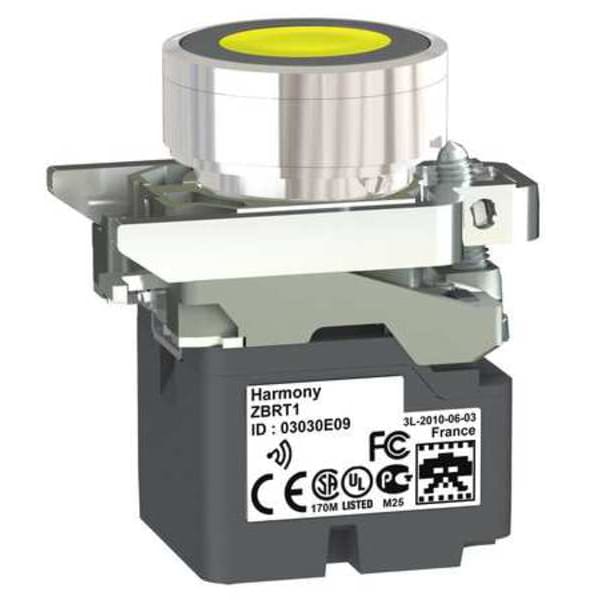 Wireless Push Button Transmitter, Color Yellow, Action Momentary, Material Metal, NEMA Rating 12, IP Rating IP30, Number of Operators 1, Size 22 mm, Type of Operator Flush Push Button, Height 1.3 in, Width 3.39 in, Length 2.05 in, Legend Markings No Legend, Standards CSA C22.2 No.14, EN/IEC 60947-1, EN/IEC 60947-5-1, UL 508