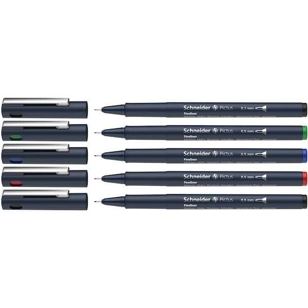 The Schneider Pictus Fineliner is ideal for drawing, sketching, illustrating and writing with its stabilized, metal-encased writing tip. Suitable for use with rulers and templates for precise layouts and durability. The water-based, pigmented ink is highly resistant to fading and waterproof according to ink standard ISO 14145-2 for long-lasting, bright colors. The barrel consists of a minimum of 85% recycled plastic. Each pack includes 5 pens in assorted sizes and colors.
