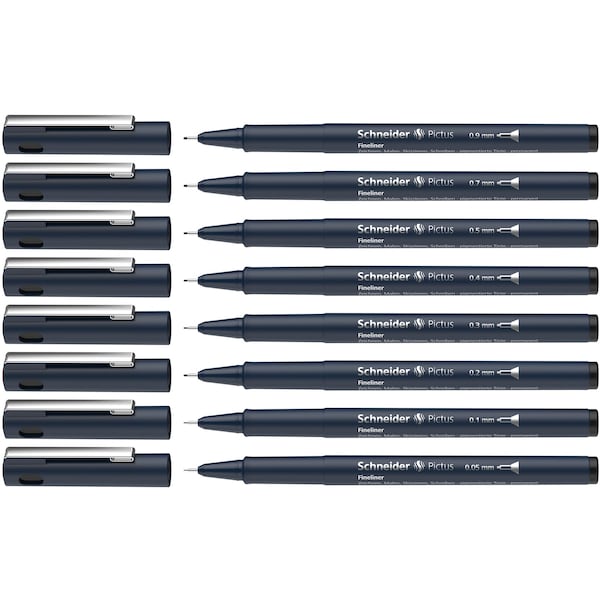 8 fineliners, one each in black ink: 0.05 mm, 0.01 mm, 0.2 mm, 0.3 mm, 0.4 mm 0.5 mm, 0.7 mm, 0.9 mm