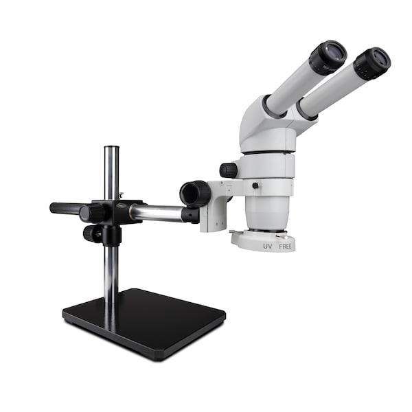 E-Series 20° Binocular Head with 10x Eyepieces (Pair), 1:6 Zoom Body (0.8x-5x), 0.5x Achromatic objective Lens, compact LED ring light. (IL-LED-E1). 76mm focus mount, and single arm boom stand.