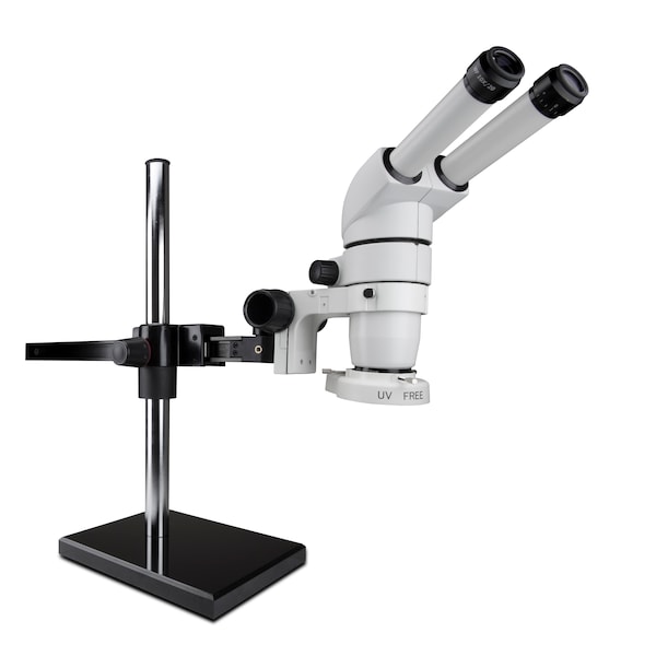 E-Series 20° Binocular Head with 10x Eyepieces (Pair), 1:6 Zoom Body (0.8x-5x), 0.5x Achromatic objective Lens, Compact LED ring light. (IL-LED-E1). 76mm focus mount, and gliding arm boom stand.