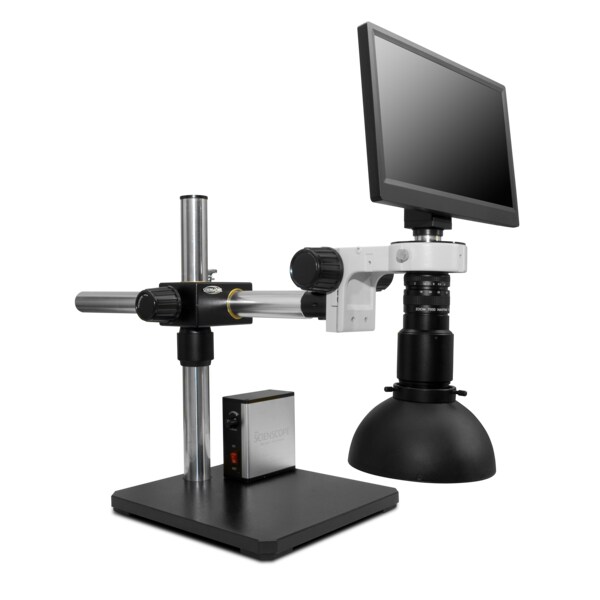 MACRO video zoom optics (up to 40x magnification with 8" working distance) on single arm boom stand, 1080p HD camera and 12" LCD monitor combination with diffused LED dome light. All systems include camera/monitor combo with 8GB SD card, wireless mouse, USB cable, power supply, and image capture software.