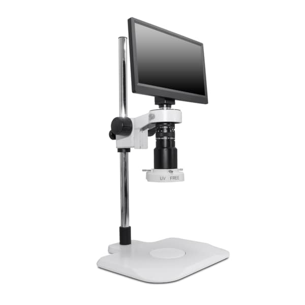 MACRO video zoom optics (up to 40x magnification with 8" working distance) on extended post stand, 1080p HD camera and 12" LCD monitor combination with diffused compact LED ring light. (IL-LED-E2D). All systems include camera/monitor combo with 8GB SD card, wireless mouse, USB cable, power supply, and image capture software.