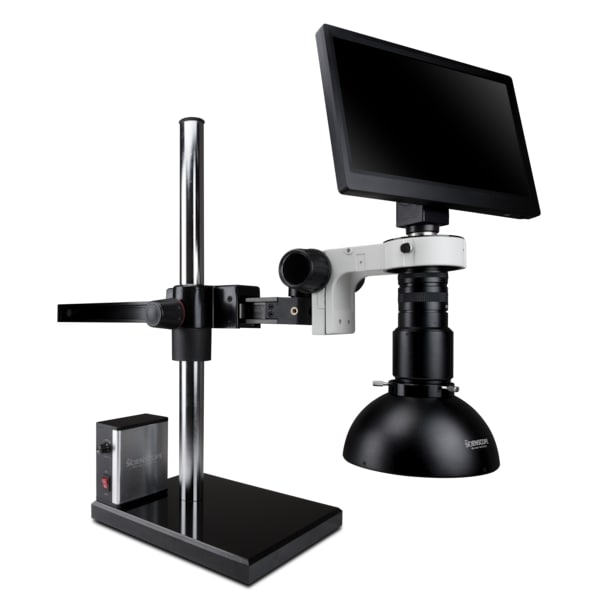 MACRO video zoom optics (up to 40x magnification with 8" working distance) on gliding arm boom stand, 1080p HD camera and 12" LCD monitor combination with diffused LED dome light (IL-LED-R2D). All systems include camera/monitor combo with 8GB SD card, wireless mouse, USB cable, power supply, and image capture software.