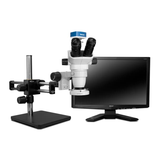 SZ Stereo Zoom TRUE Trinocular, 10x eyepieces, eye guards, dual arm boom stand with 76mm e-arm, 0.5x auxiliary lens, 0.5x video coupler, compact LED ring light. (IL-LED-E1) Features NEW 1080p HDMI/USB camera (Includes SD card, USB cable and mouse) with 23" HD LCD monitor and capture software.