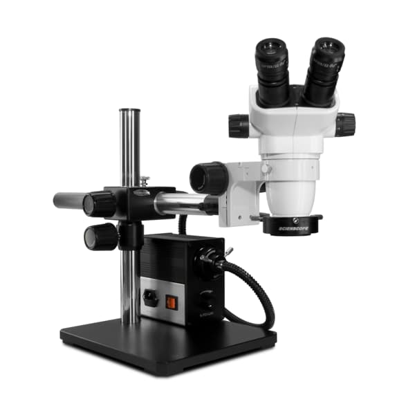 SSZ-II Stereo Zoom Binocular, 10x Eyepieces, single arm boom stand with 76mm e-arm, 0.5x auxiliary lens, LED fiber optic illuminator, Fiber optic annular ring light guide.