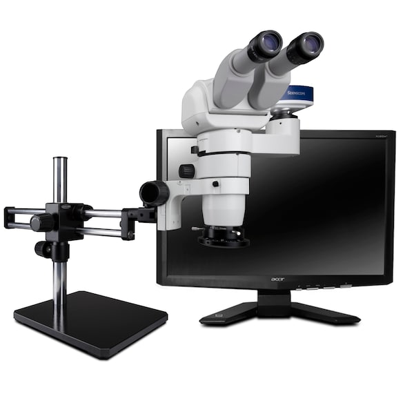 E-Series 0°-45° Tilting Binocular Head with 10x Eyepieces (Pair), 1:6 Zoom Body (0.8x-5x), 0.5x Achromatic objective Lens, NEW high intensity LED ring light. (IL-LED-R3E), 76mm focus mount, and dual arm boom stand. 0.4x video coupler and beam splitter. Features NEW 1080p HDMI/USB camera (Includes SD card, USB cable and mouse) with 23" HD LCD monitor and capture software.