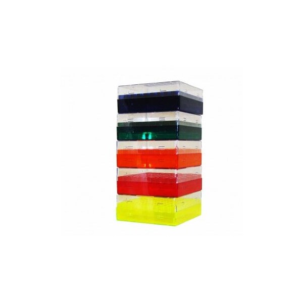 Assorted color pack includes one of each color: Green, Yellow, Blue, Orange and Red Dimensions (Inches): 5 1/4 x 5 1/4 x 2 1/8 Format: 9 Rows x 9 Columns Maximum Tube Dimensions: 12mm Diameter, 49mm High Certified free of RNase, DNase, DNA and PCR inhibitors Endotoxin-free Polycarbonate WIthstand -196°CShipping Weight: 2 lbs