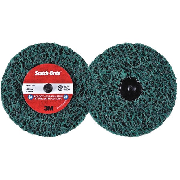 Clean and Strip Disc, Abrasive Type Non-Woven, Abrasive Material Aluminum Oxide, Backing Material Not Applicable, Backing Weight Not Applicable, Coating Coverage Not Applicable, Grade Extra Coarse, Grit Not Applicable, Overall Diameter 4 in, Quick Change System TR, Series XC-DR+, Maximum Operating Speed 12,000 RPM, Color Green