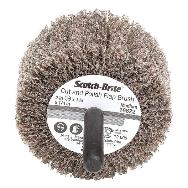 Surface Conditioning Flap Wheel, Abrasive Material Aluminum Oxide, Abrasive Type Non-Woven, Backing Material Not Applicable, Backing Weight Not Applicable, Grit 80, Series CP-FB, Flap Width 1 in, Maximum Operating Speed 12,000 RPM, Shank Size 1/4 in, Overall Diameter 2 in, Grade Medium, Shank Type Straight
