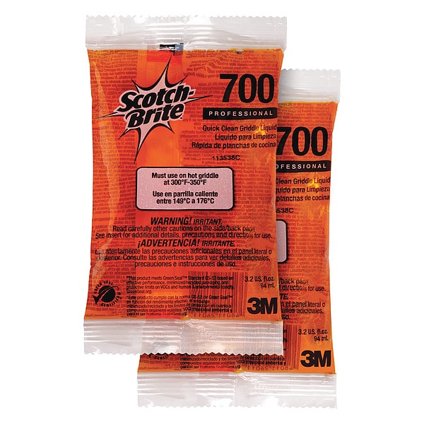 Griddle Cleaner and Degreaser, Container Type Packet, Container Size 3.2 oz, Cleaner Form Liquid, Fragrance Unscented, Product Label Quick Clean Griddle Liquid, Ready to Use/Concentrated Ready to Use, Standards GRAS Listed, Green Seal Certified, Base Formula Water-Based, Biodegradable No, Butyl Free Yes, Color Orange, Flash Point None, Maximum Effective Temperature 350 Degrees F, Minimum Effective Temperature 300 Degrees F, NSF Rating Not Rated, Nonflammable Yes, Phosphate Free Yes