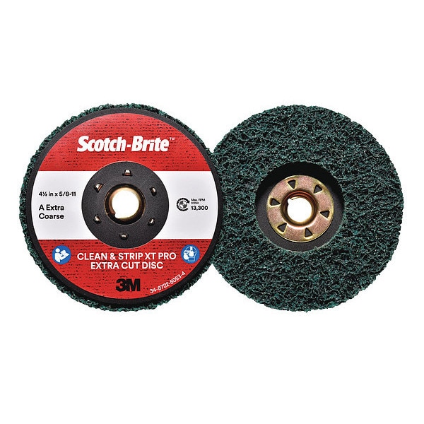 Non-Woven Depressed Center Disc, Abrasive Material Aluminum Oxide, Grade Extra Coarse, Overall Diameter 4 1/2 in, Series CX-DN, Maximum Operating Speed 13,300 RPM, Connector Size 5/8 In.-11, Connector Type Threaded Hole, Abrasive Type Non-Woven, Backing Material Nylon Mesh, Color Green, Disc Shape Type Type 27, Quick Change System TN, Resistance Properties Load