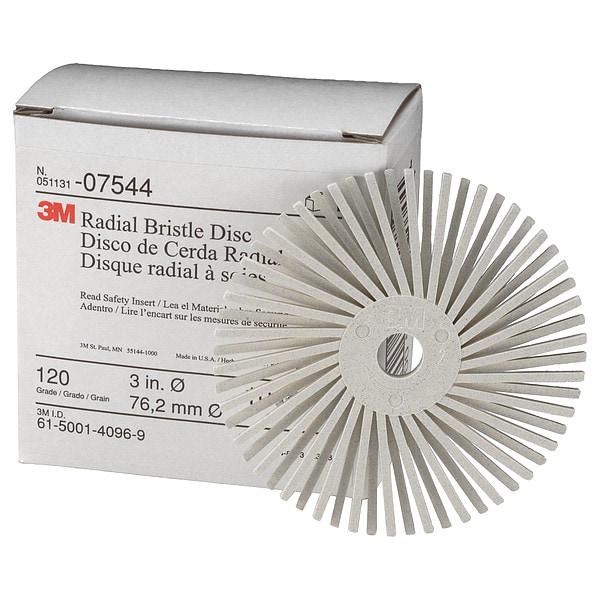 Radial Bristle Disc, Bristle Type Type A, Product Type Radial Bristle Disc, Bristle Material Ceramic, Brush Dia. 9/16 in, Grit 120, Face Width 1/16 in, Bristle Diameter 0.563 in, Bristle Length Not Applicable, Compatible Tool Type Die Grinder, Drill Press, Pencil Grinder, Straight Grinder, Primary Material Application Aluminum, Brass, Bronze, Cast Iron, Stainless Steel, Steel, Connector Type Unthreaded Hole, Connector Size 1/16 in, Operating Speed - Maximum 35,000 RPM, Color White, Series RB-ZB