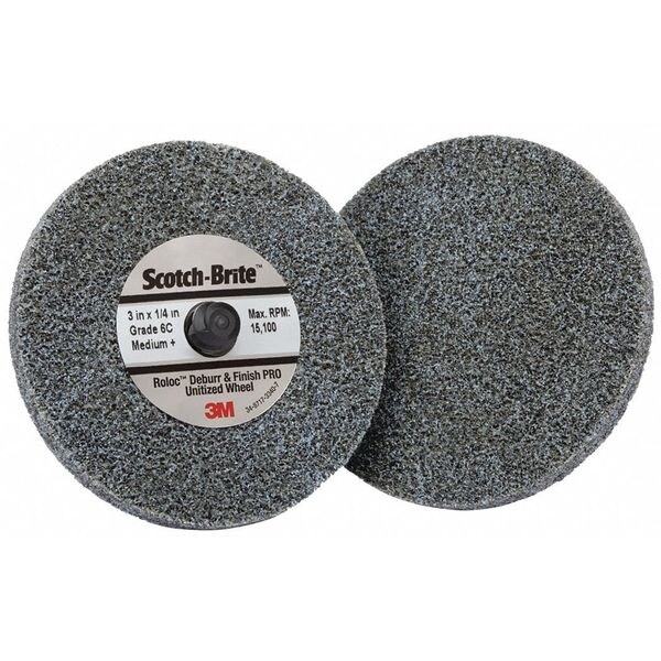 Unitized Wheel, Abrasive Material Ceramic, Density Rating Medium/Soft (6), Grade Medium, Series DP-UR, Face Width 1/4 in, Maximum Operating Speed 15,100 RPM, Overall Diameter 3 in, Connector Size Not Applicable, Connector Type Quick Change, Quick Change System TR, Abrasive Type Non-Woven, Color Gray, Resistance Properties Load