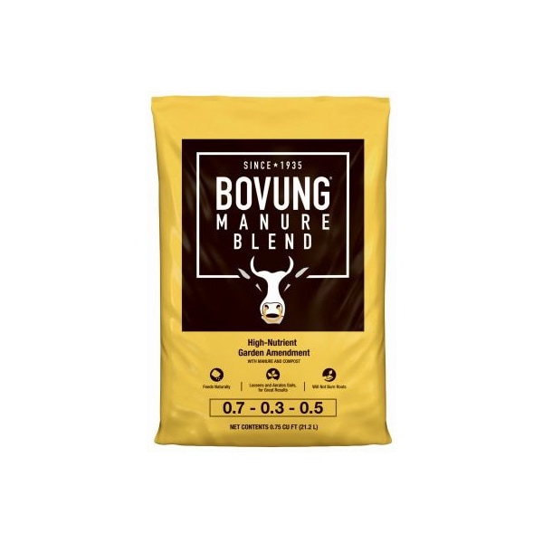 Bovung, 25 LB, 070305, Dehydrated Manure, Natural product that feeds slowly and won't burn roots Contains nutrientrich organic matter to improve soil conditions Loosens and aerates clay soil improves nutrient retention in sandy soil Great for growing high nutrients consuming vegetables, like tomatoes, peppers and eggplant Pulverized to mix easily with soil