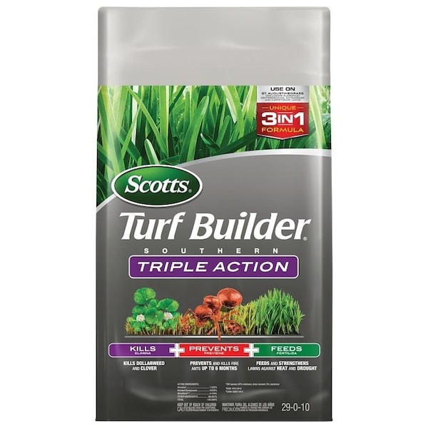 Scotts Turf Builder Southern triple action is a innovative 3in1 formula that prevents and kills fire ants for up to 6 months, kills stubborn weeds like dollar weed, clover and feeds and strengthens your lawn against Southern stresses like heat and drought Scotts Turf Builder triple action south is for use on southern grasses, like St Augustine including Floratam, Carpet grass, Centipede and Zoysia grass