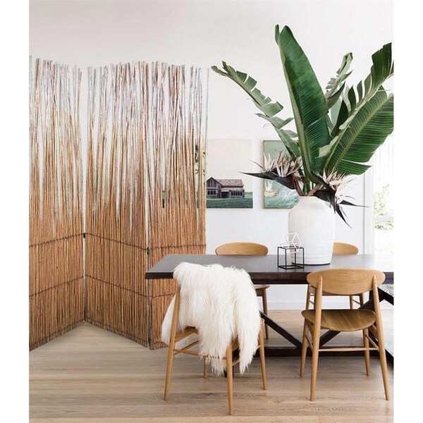 Screen Gems Juniper Screen SG-348. This beautiful room divider features a tri-fold design with a trio of white willow panels that are held in place by metal hinges. Perfect for separating rooms, hiding clutter or to fill any large space. Adds a bright spot to any room. Finished on both sides.