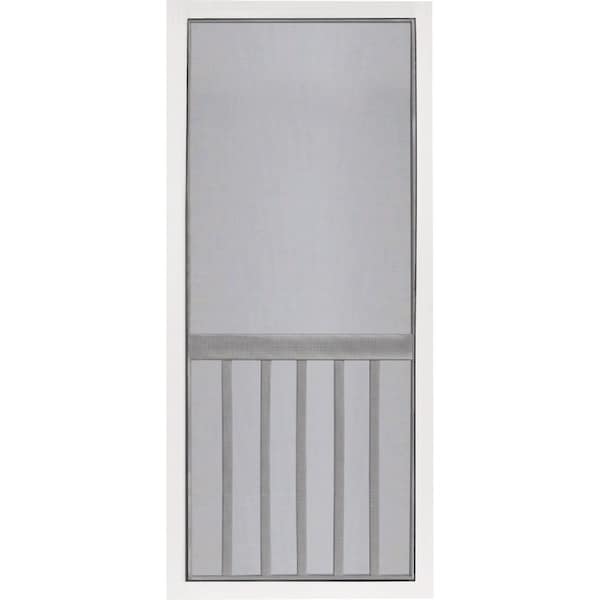 Bring fresh air and sunlight into the home with the Vinyl Five Bar screen door from Screen Tight. The popular five bar design matches porch balusters and provides extra screen protection. This solid vinyl screen door offers the classic look and feel of wood plus the durability of maintenance-free vinyl. UV-protected vinyl prevents fading or discoloration with age; no painting required. Patented welded-joint frame for added strength and durability. Charcoal fiberglass screen installed with 0.155 In. spline and can be easily removed for painting and screen repair. Easy-to-trim solid vinyl door frame allows for trimming 3/8 In. off the top left and right sides and 1 In. off the bottom. Reversible handing for right or left-handed use. The patented design creates an extremely strong door frame and allows for simple screen repairs requires no painting and will never rust or corrode. Heavy-duty hardware kit includes: (3) spring-loaded hinges with adjustable tension (2) door pull handles (1) galvanized hook-and-eye latch and screws.