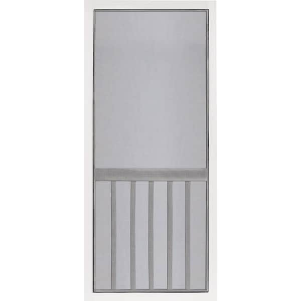 Bring fresh air and sunlight into the home with the Vinyl Five Bar screen door from Screen Tight. The popular five bar design matches porch balusters and provides extra screen protection. This solid vinyl screen door offers the classic look and feel of wood plus the durability of maintenance-free vinyl. UV-protected vinyl prevents fading or discoloration with age; no painting required. Patented welded-joint frame for added strength and durability. Charcoal fiberglass screen installed with 0.155 In. spline and can be easily removed for painting and screen repair. Easy-to-trim solid vinyl door frame allows for trimming 3/8 In. off the top left and right sides and 1 In. off the bottom. Reversible handing for right or left-handed use. The patented design creates an extremely strong door frame and allows for simple screen repairs requires no painting and will never rust or corrode. Heavy-duty hardware kit includes: (3) spring-loaded hinges with adjustable tension (2) door pull handles (1) galvanized hook-and-eye latch and screws.