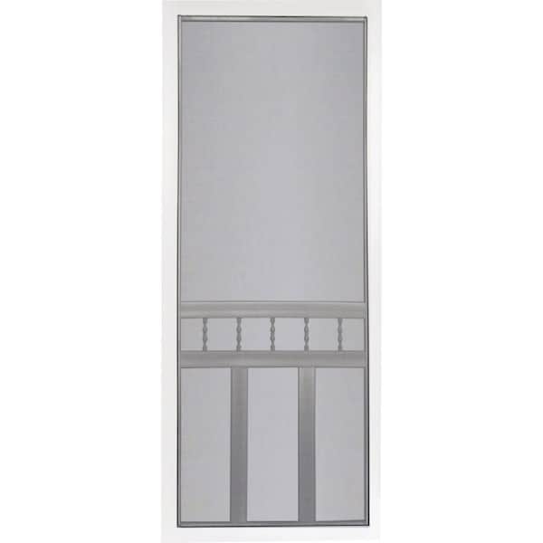 The Waccamaw solid vinyl screen door from Screen Tight features a traditional style with unique decorative spindles. This solid vinyl screen door offers the classic look and feel of wood plus the durability of maintenance-free vinyl. The patented design creates an extremely strong door frame and allows for simple screen repairs requires no painting and will never rust or corrode. UV-protected vinyl prevents fading or discoloration with age; no painting required. Patented welded-joint frame for added strength and durability. Charcoal fiberglass screen installed with 0.155 In. spline and can be easily removed for painting and screen repair. Easy-to-trim solid vinyl door frame allows for trimming 3/8 In. off the top left and right sides and 1 In. off the bottom. Reversible handing for right or left-handed use. Heavy-duty hardware kit includes (3) spring-loaded hinges with adjustable tension (2) door pull handles (1) galvanized hook-and-eye latch and screws.
