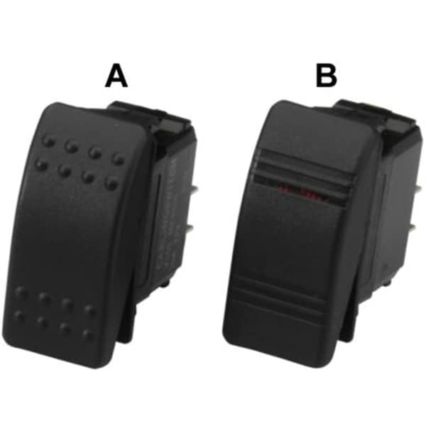 -Stamped brass and molded nylon construction -Rated at 20 amps Made from stamped brass and injection molded nylon these switches are rated at 20 amps and run on a 12V charge. They mount in a 13/16 x1-7/16 hole.Switch B is illuminated when at ON position.