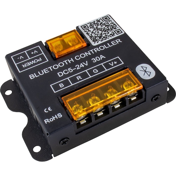 Optional Bluetooth Smart Phone Controller - RGBUsing Bluetooth technology, this RGB LED controller lets you operate LED RGB Rod holders 325181, LED RGB Tube inserts 325189, LED RGB Rod holder caps 325188, and LED RGB strips lights with your smartphone IOS 6 or Android 4.0 and above. Choose from numerous dynamic color-changing modes with adjustable speed and brightness levels or from static color modes. Additional features include a color-selection wheel, 6 timer settings, music control, mode/color-change via phone shake, and photo color match matches specific colors in photos. This LED controller has a maximum load capacity of 10 amps per channel and is compatible with LED light strips that operate within a 5-24 VDC range. The maximum load is 400 watts at 12 volts or 800 watts at 24 volts. The controller works within 50' of your phone. For dry locations only. CE, RoHS compliant.Features:Smartphone control using Bluetooth technologyDynamic or static color modesCustomized color, brightness, speed, and timer settingsMusic sound control capabilityPhone shake color/mode change and photo color matching50' Range