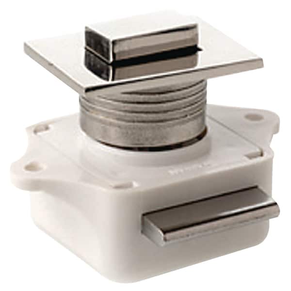 Constructed of sturdy plastic with a corrosion resistant 304 stainless steel knob. Streamlined design features a positive action closure ensuring cabinets and drawers stay closed until the button is deliberately pushed. . Latch installs with two #6 RH fasteners; strike plates require two #4 FH fasteners (fasteners not included).
