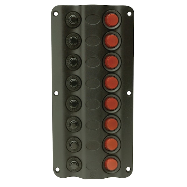 Molded black plastic; 12V; Pre-drilled with countersunk holes to accommodate #8 screws; Contains (1) 4A, (2) 5A, (2) 6A, (2) 8A, and (1) 10A breakers
