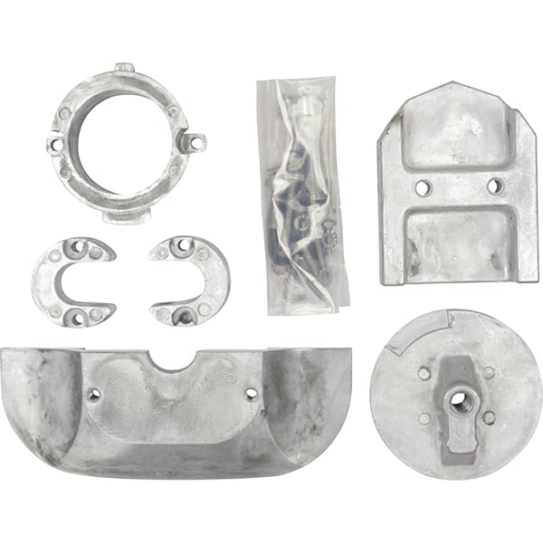 Includes: Block anode for gimbal housing (1); Anode plate for top of ventilation plate (1); Skeg for ventilation plate (1); Collar anode for trim rams (2) ; Anode collar between prop and gear housing (1) ; 316 Stainless steel screws