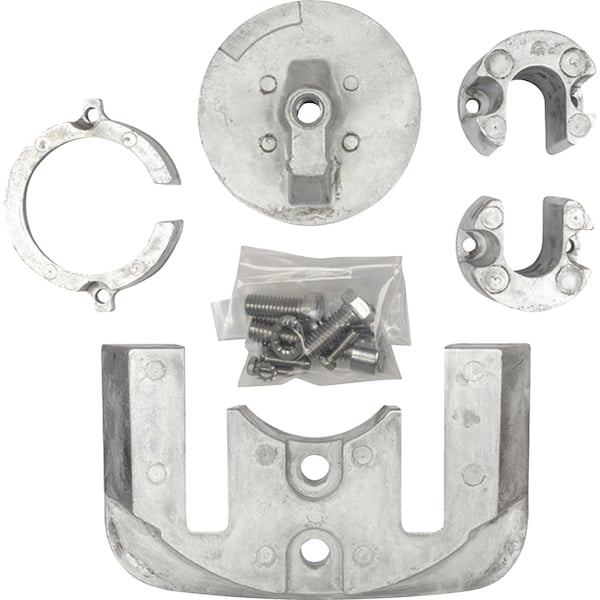 Includes: Block anode for gimbal housing (1); Skeg for ventilation plate (1) ; Anode collar between prop and gear housing (1); Collar anode for trim rams (2) ; 316 Stainless steel screws