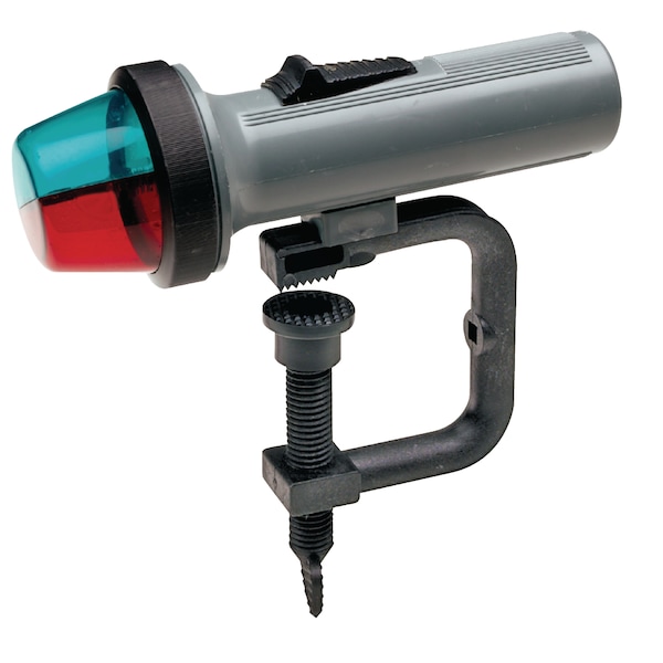 Red/Green portable bow light with adjustable clamp for horizontal surfaces. Requires 2 D cell batteries.