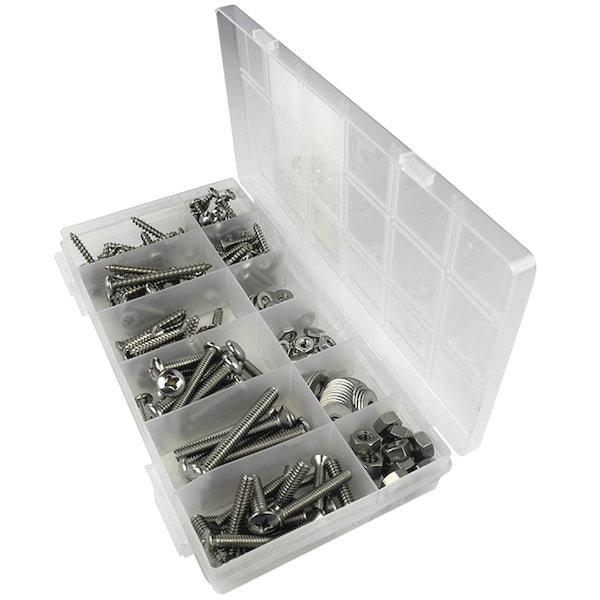 Stainless Steel assortments are packaged in compartmented strong, clear plastic re-closable storage cases. Kit Contains: Pan & Oval Tapping Screws:(8) #6 x 1/2", (8) #6 x 3/4", (8) #8 x 3/4", (8) #8 x 1", (6) #10 x 3/4", (5) #10 x 1", (4) #10 x 1-1/2", (2) #12 x 1", (2) #12 x 1-1/2", (2) #12 x 2"Pan & Oval Machine Screws:(4) 10-24 x 1", (4) 10-24 x 1-1/2", (2) 10-24 x 2", (4) 1/4-20 x 1", (4) 1/4-20 x 1-1/2", (2) 1/4-20 x 2"Hex Nuts(20) 10-24, (20) 1/4-20, (20) #10, (20) 1/4"