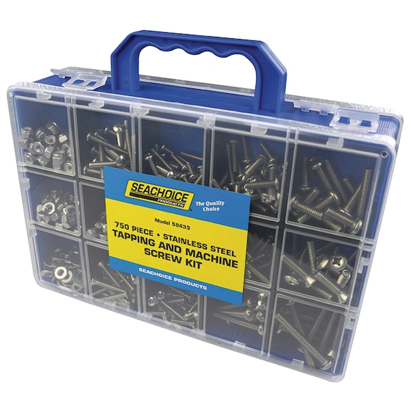 Stainless Steel assortments are packaged in compartmented strong, clear plastic re-closable storage cases. Kit Contains:(30) #6 x 1/2" pan & oval tapping screws(30) #6 x 3/4" pan & oval tapping screws(20) #6 x 1" pan & oval tapping screws(30) #8 x 1/2" pan tapping screws(50) #8 x 3/4" pan & oval tapping screws(40) #8 x 1" pan & oval tapping screws(20) #8 x 1-1/2" pan & oval tapping screws(10) #10 x 1/2" pan tapping screws(50) #10 x 3/4" pan & oval tapping screws(30) #10 x 1" pan & oval tapping screws(20) #10 x 1-1/2" pan & oval tapping screws(20) #10 x 2" pan & oval tapping screws(10) 8-32 x 1/2" pan mach. screws(20) 8-32 x 3/4" pan & oval mach. screws(20) 8-32 x 1" pan & oval mach. screws(20) 8-32 x 1-1/2" pan & oval mach. screws(8) 8-32 x 2" pan & oval mach. screws(10) 10-24 x 1/2" pan mach. screws(20) 10-24 x 3/4" pan & oval mach. screws(20) 10-24 x 1" pan & oval mach. screws(20) 10-24 x 1-1/2" pan & oval mach. screws(8) 10-24 x 2" pan & oval mach. screws(4) 1/4-20 x 3/4" pan mach. screws(14) 1/4-20 x 1" pan & oval mach. screws(8) 1/4-20 x 1-1/2" pan & oval mach. screws(8) 1/4-20 x 2" pan & oval mach. screws(60) 8-32 & 10-24 & 1/4-20 hex nuts(60) 8-32 & 10-24 & 1/4-20 locknuts(90) #8 & #10 & & 1/4" flat washers