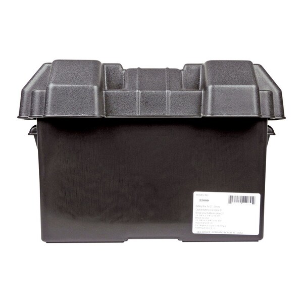 27 Series Battery Box (22080) by Seachoice®. Black molded high density polyethylene. Protects battery and area around battery from acid spills. Lid is designed to allow easy access around battery cables and wires. Complete with hold down strap and mounting hardware.