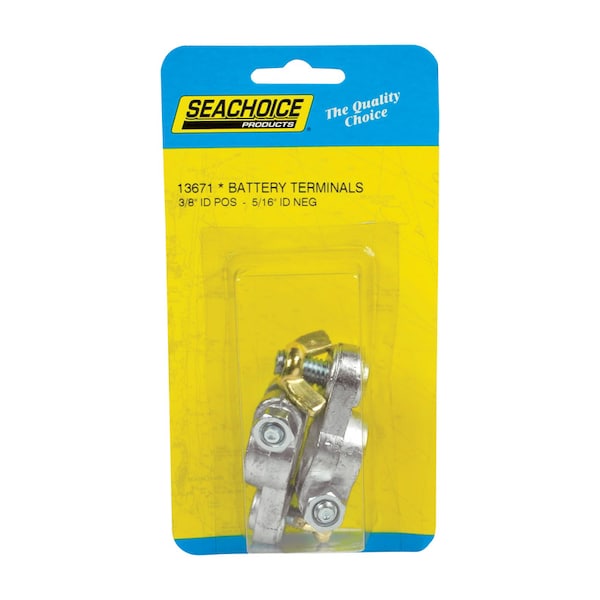 Clamp type wing nut terminal made of lead alloy. Brass-plated wing nuts 3/8 inch positive stud and 5/16 inch negative stud. Fits all standard battery posts.
