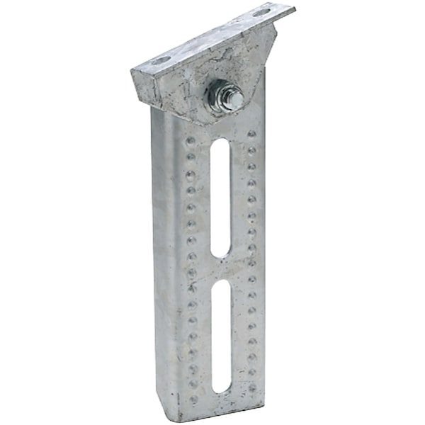 Heavy 11 gauge galvanized steel that is slotted for vertical adjustment. Non-slip dimples for secure hold. Angle bracket pivots for angled or flat mounting of 2" x 6" bunk or bolster boards. Complete with nut and bolt for angle bracket. Mounts with 1/2" bolt. Bracket angle 3.5" W.