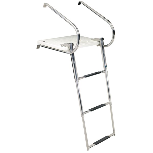 Ladder is secured with a hook & loop strap when in the stowed position. Fiberglass platform, stainless steel tubing. Includes hardware for both outboard and inboard/outboard applications. Telescoping capability. Maintenance-free high strength platform. Black plastic treads provide a secure stepping area. All stainless steel hardware included. 300 lb. Capacity